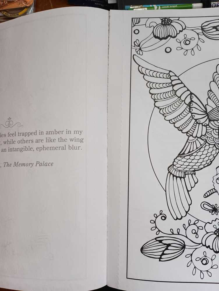I've been using some of those relaxation coloring books to generate writing prompts, and this ones binding came unglued 3/4 of the way through. Not cool Penny Press. 😐