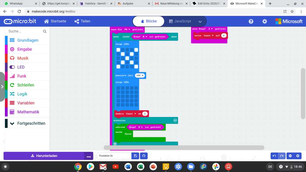 But the first loop I did was too small so that it was sending signals even when not touching the wire. It worked fine then when I had done a wider loop, somehow at least. SO I went to the second task: to make a code that if pressed B it'll not count. Good... But I tried, and tried but NONE of my ideas seemed to work. My problem was the last part actually. I tried "if else" functions. But what should I say? set "count" to "count"? change "count" with 0/-1? What is -1 even? I thought, okay but even if I press B it'll continue to count. (Unless I am wrong there, that#s just how it appears to me). So even if I said, change with 0, it would be like not doing a thing. And still counting. So i hthought, what about -1? Then it'd subtract the one it just added, right? I don't know... No code I did seemed right, because of the second part what it should do. Stephanie wrote to me and that gave me an ide. So the "if..else..." part was right. To use it, I mean. I didn't really tell me what I tried. The second part of her message brought me further. Although it did not say what exactly to do. I don't even know how they expect it. I thought the second task is based on the first task. So sort of the same functions just used different. I found a "pause" function and after some trying it didn't say it won't work soo... What did I do in the end again... I'll add a photo. Okay, I had the code. Now, try it out. But the signal flow was strange it did not sense it for somereason. Then it did so I told my sister to come and help record a video... Aaand it did not work again. In the end I used a copper-coloured Büroklammer and knocked on it with the Krokodilklammer in white having the red Krokodilklammer that was attached to that GND part of the micro:bit to it. That seemed to work pretty good and with that I got a video. It may did not work with my construction, but at least the code seemed to be working and that was all I wanted. My goal is not to play the game anyway but to learn to use the codes.