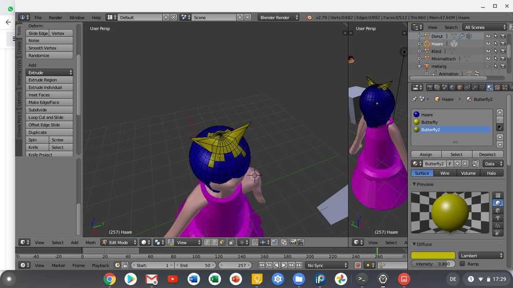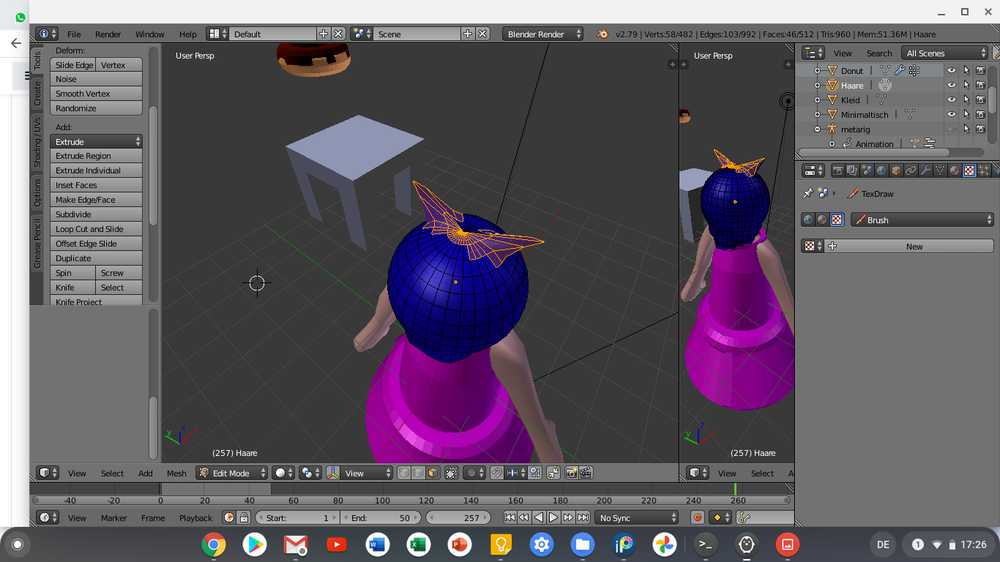16:55: so i continued and made the hair with an object and edited the human a bit. Then I added simple objects like a Donut, a minimal table and an apple. Then I cleaned the bathroom floor and randomly ate something random. One soft toast with a toasted toast and in between Nougat :D