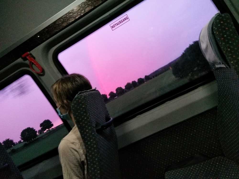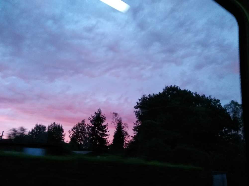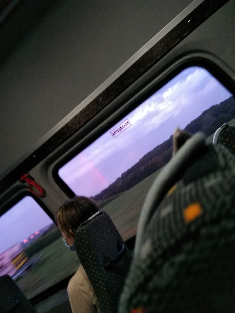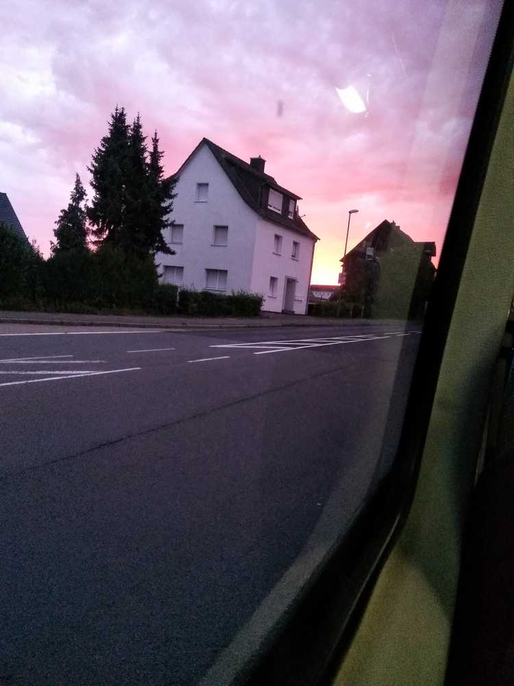 06:30: on the way to school. The sky is red/orange and blue. And guess what - to my surprise There's a rainbow!! I don't see rain or direct sun. At first it looked like tuere was a line in the sky that seperates it a bit. But even if the colour is more red, i think It's a rainbow. :D But i am sitting on the other bus side so i don't have the best view. Maybe on the way it changes and It's still visible? Actually, i don't think so, but who knows.