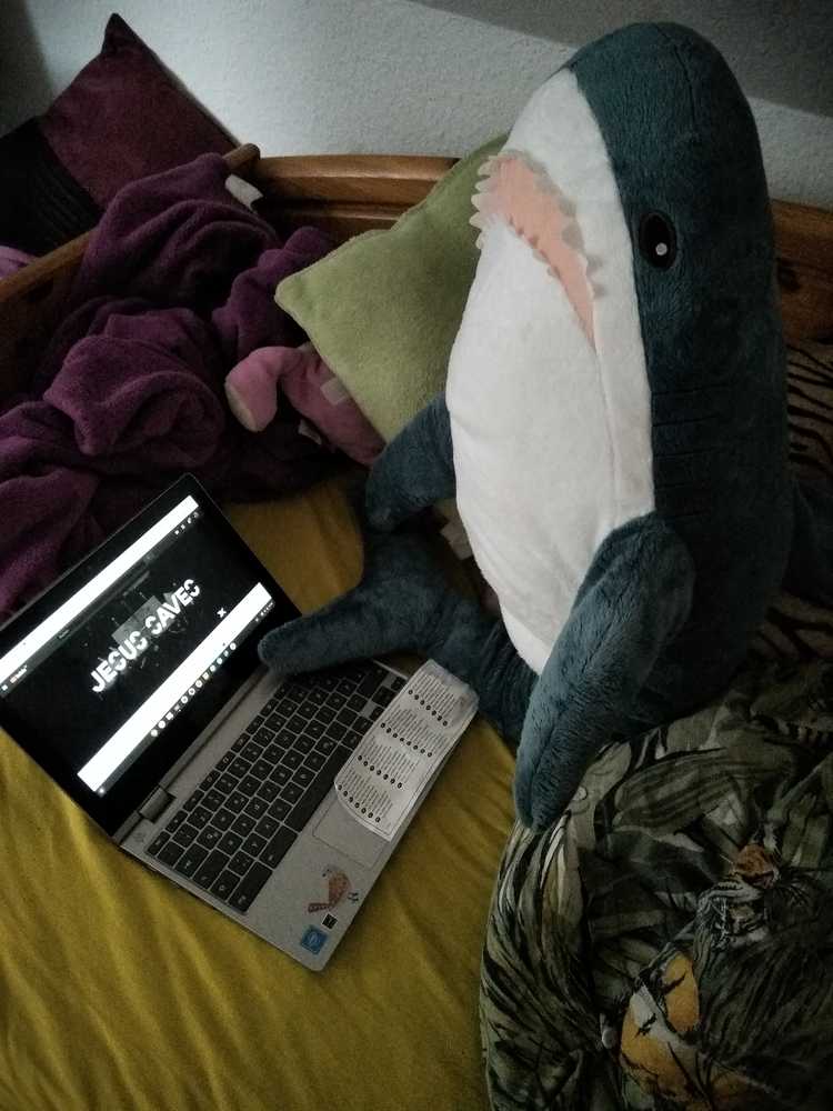 2020/07/29🍋 Wednesday 14:16: My sister and I went to Ikea today to get a shark plushie for our little brother. He was so excited about that one... But now he just woke up and looks a bit sleepy, maybe he doesn't feel well, and didn't act excitedly towards it, but I'm sure that'll change. (Nachtrag...