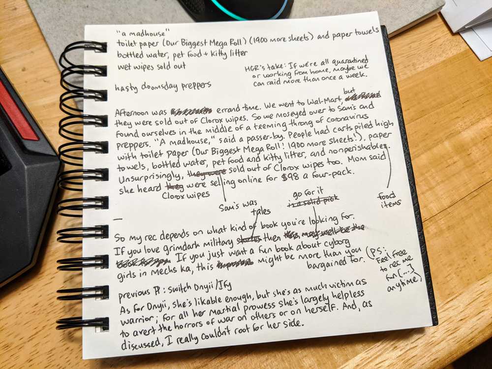 Since I wasn't at home this weekend, I did some physical journaling (to be copied into my master file later). As you can see, it's kind of a mess; I edit my writing too much to keep a proper physical journal. This sample is probably extra confusing because it contains parts from two different entrie...